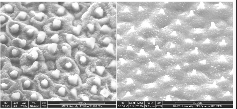 顯微鏡下的荷葉(左)和新生物塑料(右(yòu))的柱狀結構的2000放大圖像