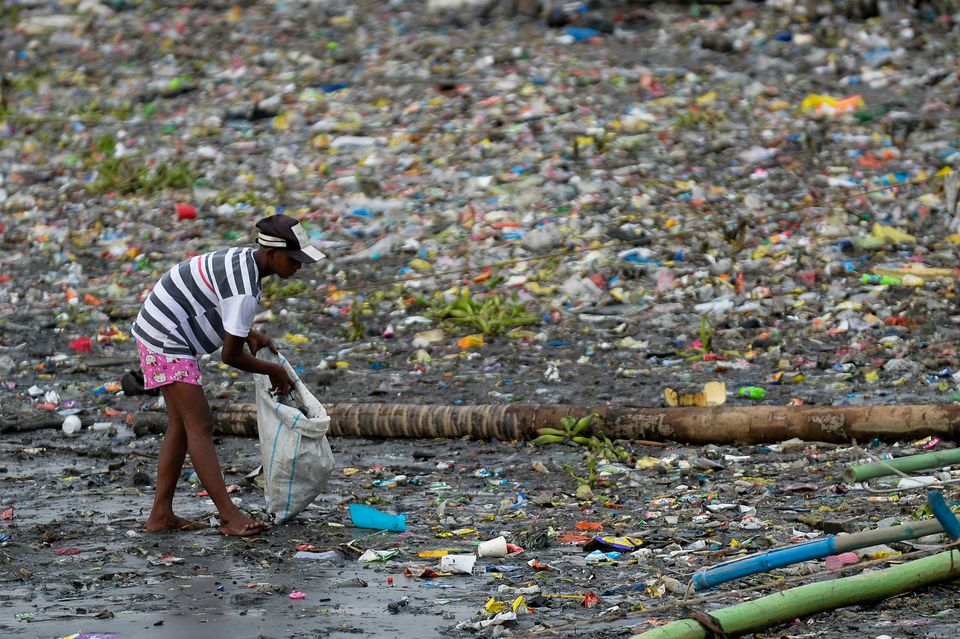 圖為一名菲律賓婦女在河岸撿塑料垃(lā)圾