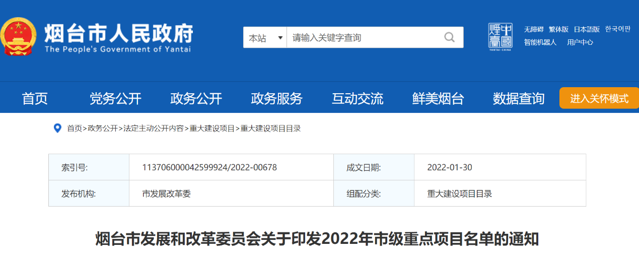 該項目已於2021年12月由煙(yān)台市(shì)生態環境局進行環評受理。
