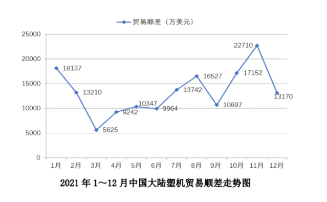 2021年1~12月,中國大(dà)陸塑料機械12個重點稅號產品進出口總額59.27億美元,同比增長27.88%。其中,進口額21.61億美元,出口額37.66億美元,分(fèn)別同比增長(zhǎng)20.81%、32.32%;貿易順差(chà)再創新高達到16.05億美元,同比(bǐ)增長51.80%。