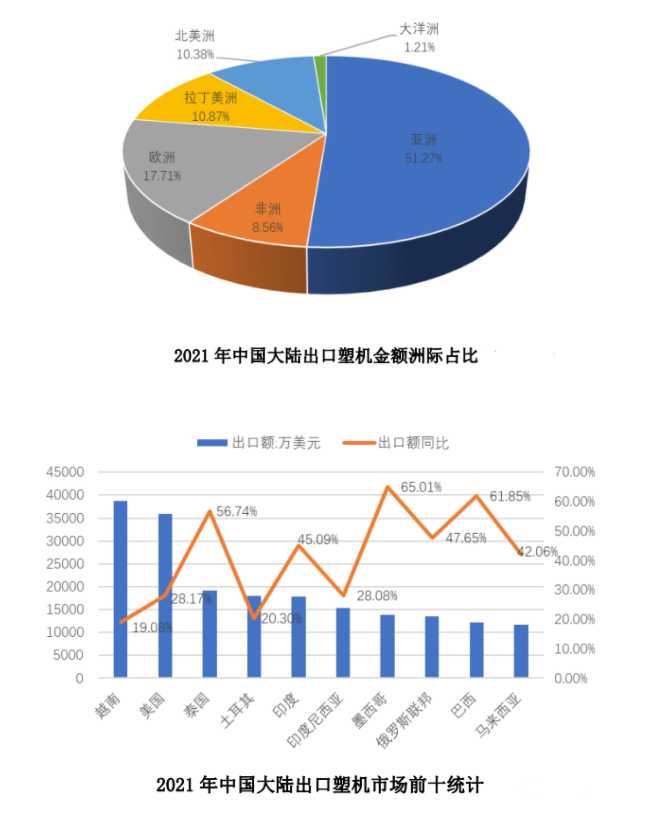 前十大市場出口額在(zài)同期塑機出口額的占比為52.11%,其中排在前兩位至(zhì)越南和美國的出口額占比分別達(dá)到10.28%、9.53%。出(chū)口至前十大市(shì)場的(de)金額同比(bǐ)增速均超過了19%,其中至泰國、印度、墨西哥、俄羅斯、巴西和馬(mǎ)來西(xī)亞的出口額同比增速則超過了42%。