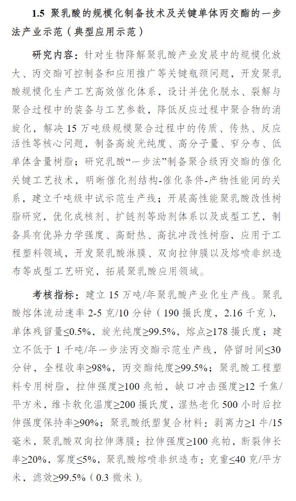 其(qí)中,煤炭清潔高效利用技術、先(xiān)進(jìn)結構與複合材料、高端功能與智能材料3個重點專項(xiàng)均涉及可降解材料。 "聚乳酸規模化製備技(jì)術及關鍵單體丙(bǐng)交酯一(yī)步法產業示範",強調,要針對聚乳酸規劃化生產和丙交(jiāo)酯技術進行攻克,還要求加大開發聚乳酸高性(xìng)能改性樹脂,拓展(zhǎn)聚乳酸在淋膜、雙向拉伸膜、熔噴布等領域應用。