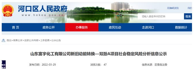 另外,3月29日(rì),山東省東營市河口區人民政府對公司的雙酚A項目進行社會穩定風險分析信息(xī)公示。