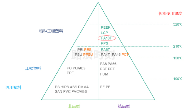 PA10T(聚對苯(běn)二甲酰癸二胺)是由對苯二甲酸和癸二胺經縮聚而成,具有優異的耐熱性能(Tm=316℃),耐化學腐蝕性能,吸水率低,尺寸穩定性好,玻(bō)纖增強改性後耐無鉛(qiān)焊錫溫度超過280℃,適合SMT製(zhì)程,綜合性能優異。
