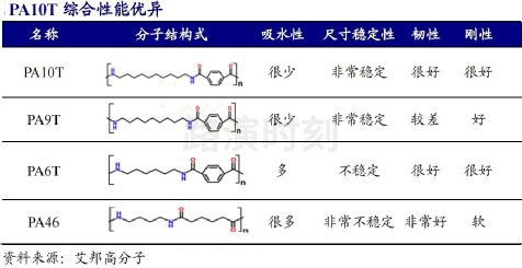 目前成熟的工業化高(gāo)溫尼龍(lóng)品種有PA46、PA6T、PA9T、PA10T等。其中,PA46和PA6T的吸水率較大,導致製品尺寸穩定性差,存在吸水後SMT起泡風險,因此在一(yī)些要求高的(de)領域,應用受到了挑戰;PA9T的吸水率低(dī),但韌性差(chà),脆性(xìng)大;PA10T是目前(qián)商業化中綜合性(xìng)能最好的耐溫尼龍。