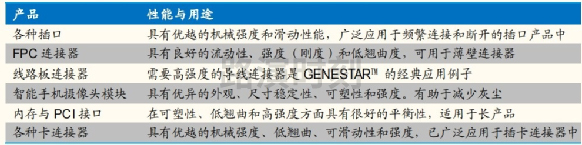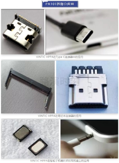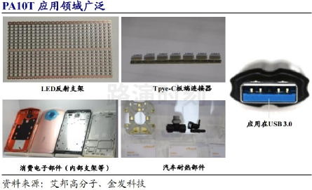 nPA10T突出的耐熱性、超(chāo)低吸水率、尺寸穩定性、高流動性、適用於(yú)薄壁快速成型以及良好的SMT適用性,可用(yòng)於SMT連接器、USB Type C連接器等電子電(diàn)氣(qì)部件;