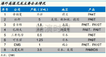 據統計,2020年全球高溫(wēn)尼龍產(chǎn)能約15.8萬噸,海外產能占(zhàn)比高達94%,產能主要集中於帝斯曼、杜邦、索爾維、EMS、可樂麗等企業。其中,帝斯曼獨家生產PA4T等相關產品,可樂麗憑在很長(zhǎng)一段時間是PA9T的(de)唯一生產商,隨著專利到期,巴斯夫也逐步推出PA9T相關產品,而其他國外企業均(jun1)以PA6T產品為(wéi)主。
