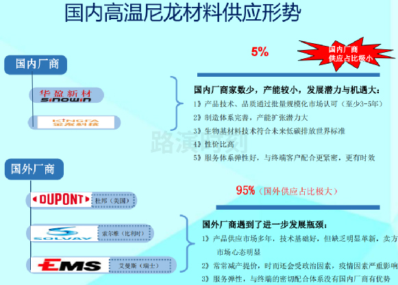 我國(guó)高溫尼龍進口依(yī)賴度(dù)高達95%,國內(nèi)能(néng)穩定批量生產(chǎn)且獲得知名客戶測試認證主要包括金發科技和華盈新材等,未來隨著國(guó)內廠家的產能規劃逐步落地,有望在電(diàn)子領域率先(xiān)實現進(jìn)口替代,而下遊(yóu)汽車(chē)領域驗證周期較(jiào)長,替代進度預計稍微慢一些。