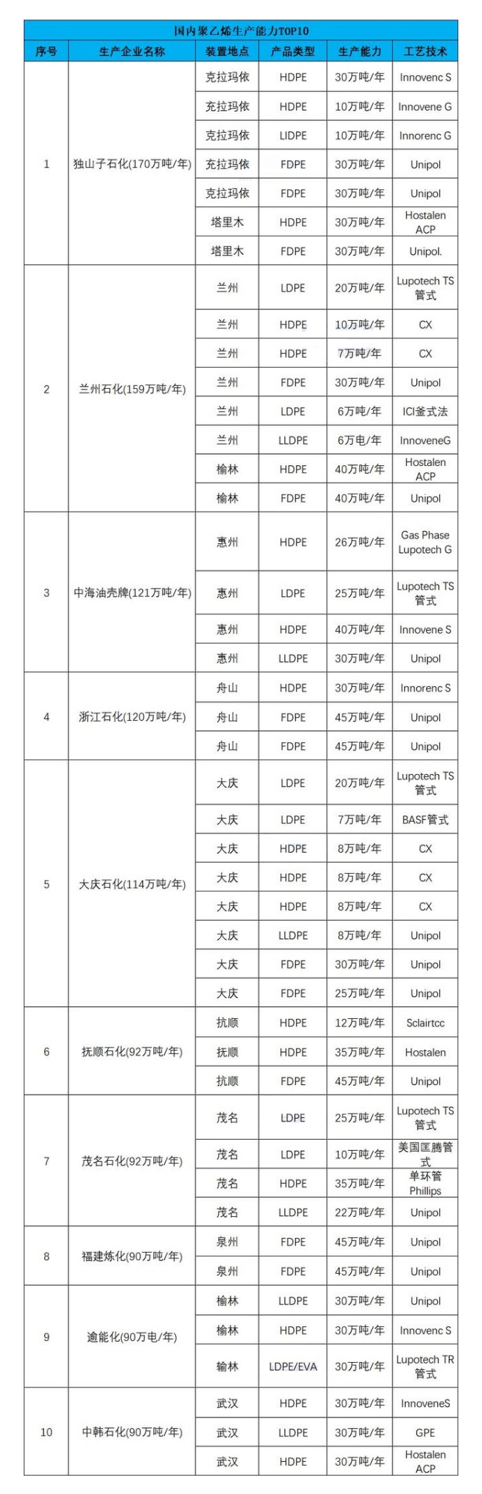 在大乙烯時代,企(qǐ)業多為(wéi)煉化一體化,湧現了浙江石化、煙台萬(wàn)華、恒力石(shí)化等地方企業,迅速(sù)擠占市場。從地域分布(bù)來看,聚(jù)乙烯生產企業(yè)仍集中在主要消費地華北、華東(dōng)、西北地區,地域內規模以上製品企業(yè)集中。從消(xiāo)費來看,像華北的農膜、管材(cái)、包(bāo)裝,華東的(de)管件、包裝、日用注塑中空等,考慮物流運輸、采購穩定性等因素,圍繞主要製品需求地,生產(chǎn)企業也較為(wéi)集中。聚乙烯本身屬於進口依存度較高的產品,刨除國內供(gòng)給,仍依托沿海青島、上海、寧波、黃埔等港(gǎng)口進(jìn)口來自中東等地資源。企業分布情況(kuàng)如下。