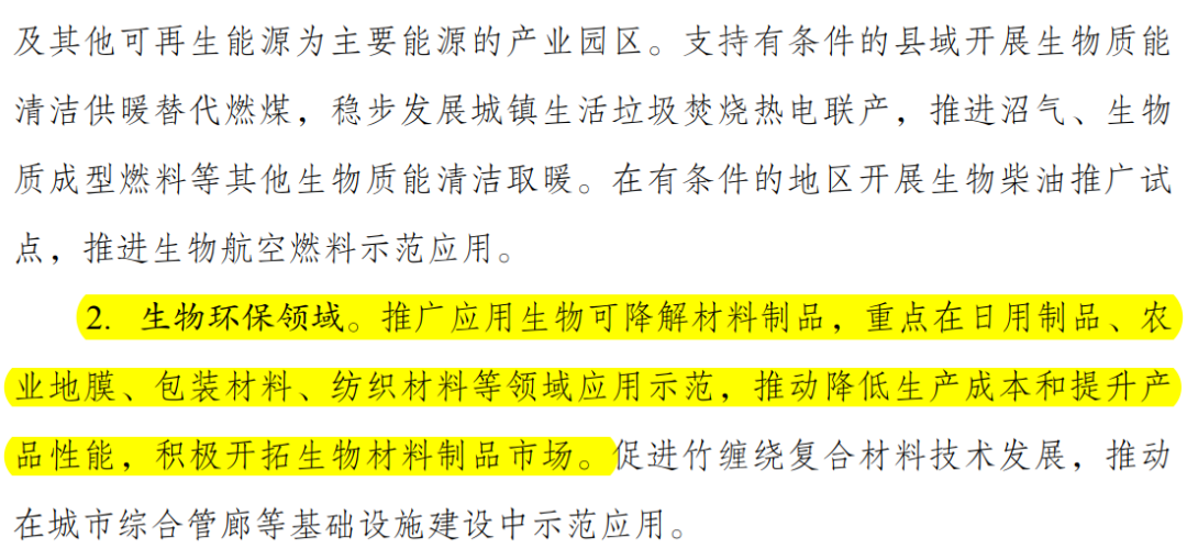 在生物環保領域,《規劃》要求,推廣應(yīng)用生物可降解(jiě)材(cái)料製品,重點在日用製品、農業地膜、包裝材(cái)料、紡織(zhī)材料等領域應用示範,推動降低生產成本和提升產品性能,積極開(kāi)拓(tuò)生物材料製品市場。促進竹纏繞複合材料技術發(fā)展,推動在城市綜(zōng)合管廊等基礎設施建(jiàn)設中示範應(yīng)用。