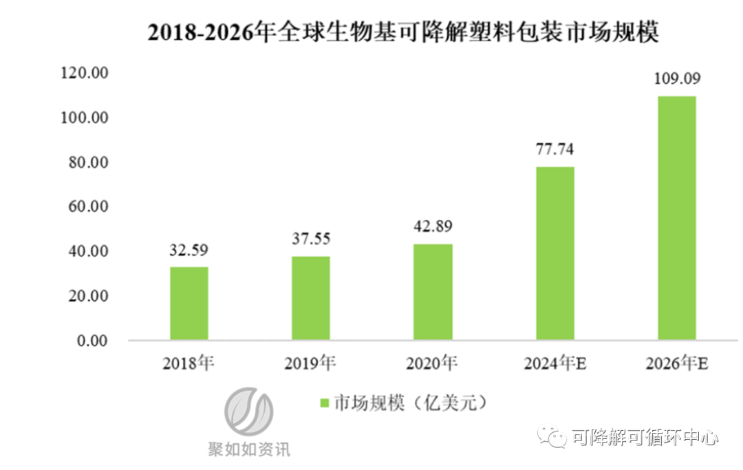 2020 年全球生物基可降解(jiě)塑(sù)料包裝市場(chǎng)規(guī)模約為42.89億美元(yuán),較2018 年增長超過10億美元,預計(jì)至 2026年將增長至 109.09 億美元。