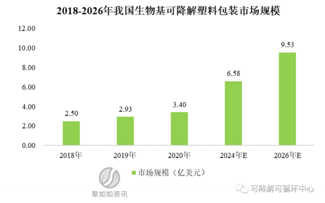 2020年我國生物基可(kě)降解塑料(liào)包裝市場規模約為3.40 億(yì)美元,預計將於2026年(nián)增長至9.53億美元,年複合增長率將達到18.72%,具有良好的市場前景。