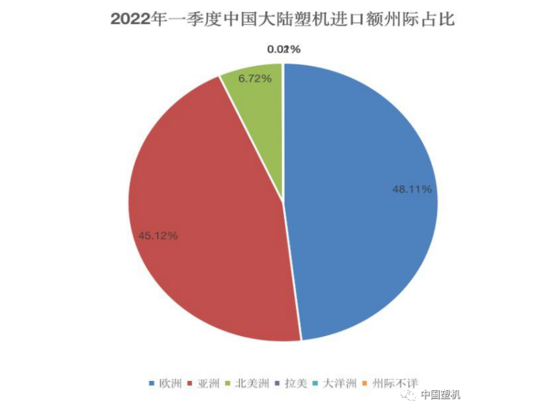 進口分布:從洲際看,2022年一(yī)季度中國大陸從歐洲(zhōu)進口塑(sù)機金額3.67億美元,同比增長79%;從亞洲進口塑機金額3.44億美元,同比增長31%。在(zài)進口來源地前十位中,從日本、德國的進口額依然(rán)位居前兩位,進口額分別為2.60億元、2.57億(yì)元,同比分(fèn)別增長(zhǎng)24%、86%;中國(guó)台灣、意大(dà)利(lì)、美國位列第(dì)三、四、五位,進口額分別為4594萬美(měi)元、4227萬美元、3304萬美元,同比分別增長64%、37%、106%。