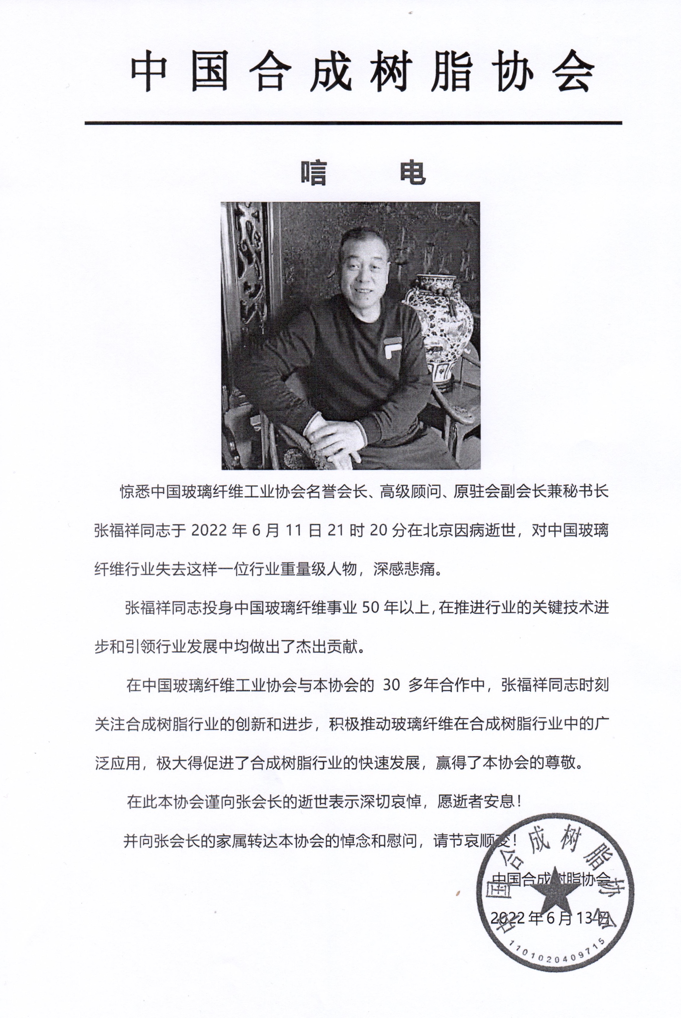 (协会发布)沉痛悼念中国玻璃(lí)纤维工业协会名誉会长张福祥同志