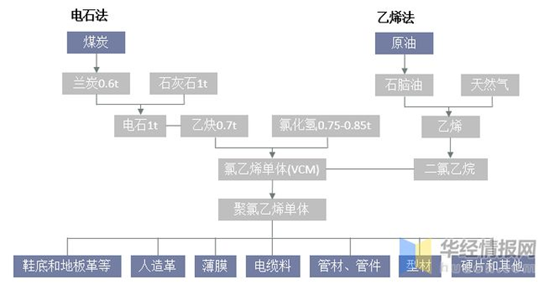 PVC生產工藝主要為“電石法”和“乙烯法”,其原材料分別為煤炭和原油。全球絕大部分國家采用石油(yóu)天(tiān)然氣路線。由於中國貧油富(fù)煤,我國PVC生產工藝以電石法為主。
