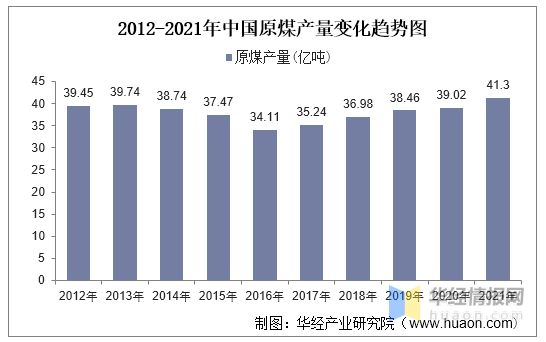 用電石法生產PVC的原材料為煤炭,2012年以來,我國原煤產量(liàng)呈現出先下降後上升的走勢,據(jù)國家統計局數據,2021年全國原煤產量達到41.3億噸(dūn),較2020年提升2.28億(yì)噸。