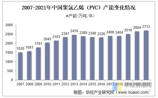 隨著國民經濟的迅速發展,我(wǒ)國PVC產能(néng)在快速提升。2007年以來,我國PVC產能總體上呈(chéng)增長趨勢。據中國氯堿工業協會數(shù)據,2021年,中國聚氯乙烯(PVC)總產(chǎn)能達2713萬噸/年,較2020年提升49萬噸/年。