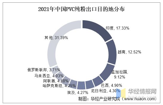 從出口目的地來看,我國PVC純粉產品主要出口南亞、東南亞以及(jí)中亞的部分地區,印度仍是中國PVC純粉出口(kǒu)的主要目的地,2021年(nián)全年,中國出(chū)口至印度(dù)的PVC純粉(fěn)達到(dào)30.4萬噸,占(zhàn)中國(guó)出口總量的17.33%;出口至越南(nán)的PVC純粉22萬噸(dūn),占比12.5%;出口至孟加拉國的PvC純粉16萬噸(dūn),占比9.1%。