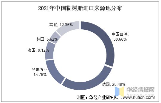 2021年我國累計進口糊樹脂8.46萬(wàn)噸,國內糊樹(shù)脂主要從中國台灣、德(dé)國、馬來西亞等地進口,2021年的占比分別為30.66%、28.49%、13.76%。