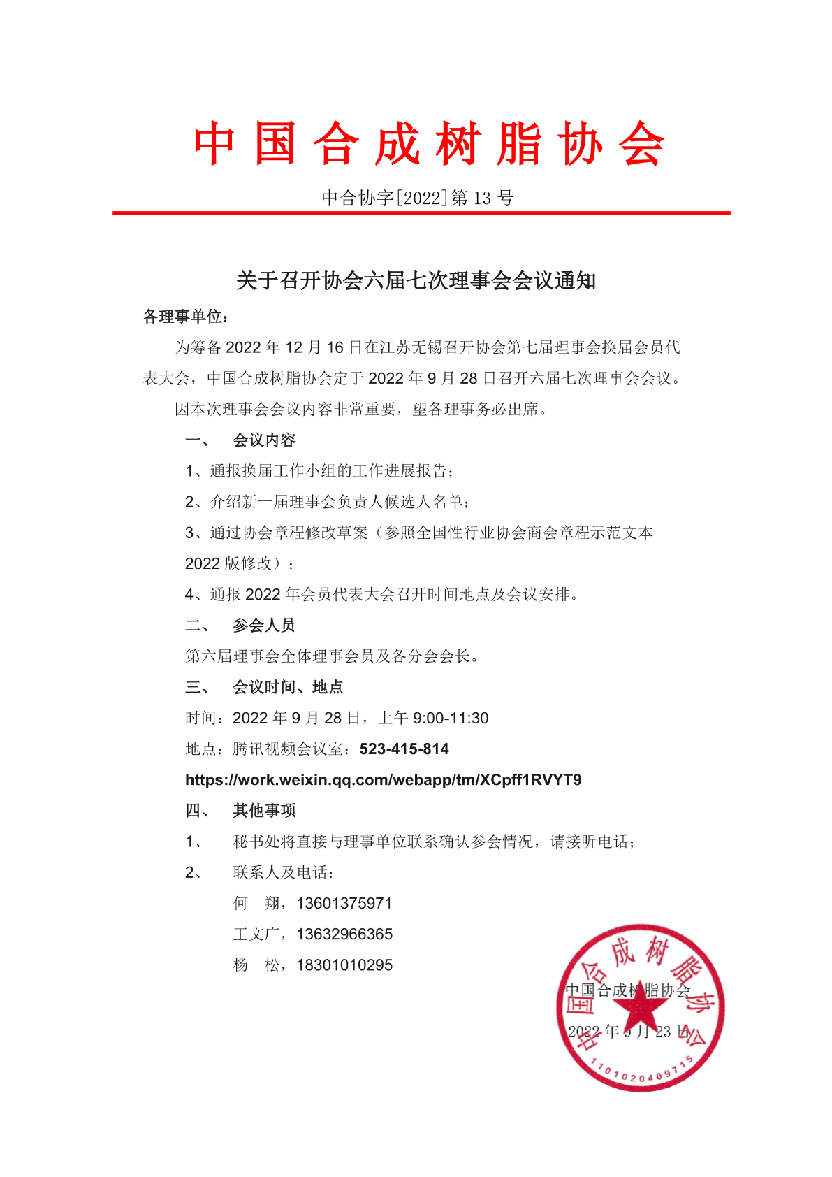 【会议通知】中国国产精品免费福利树脂协会(huì)六届七次理事会会议通知