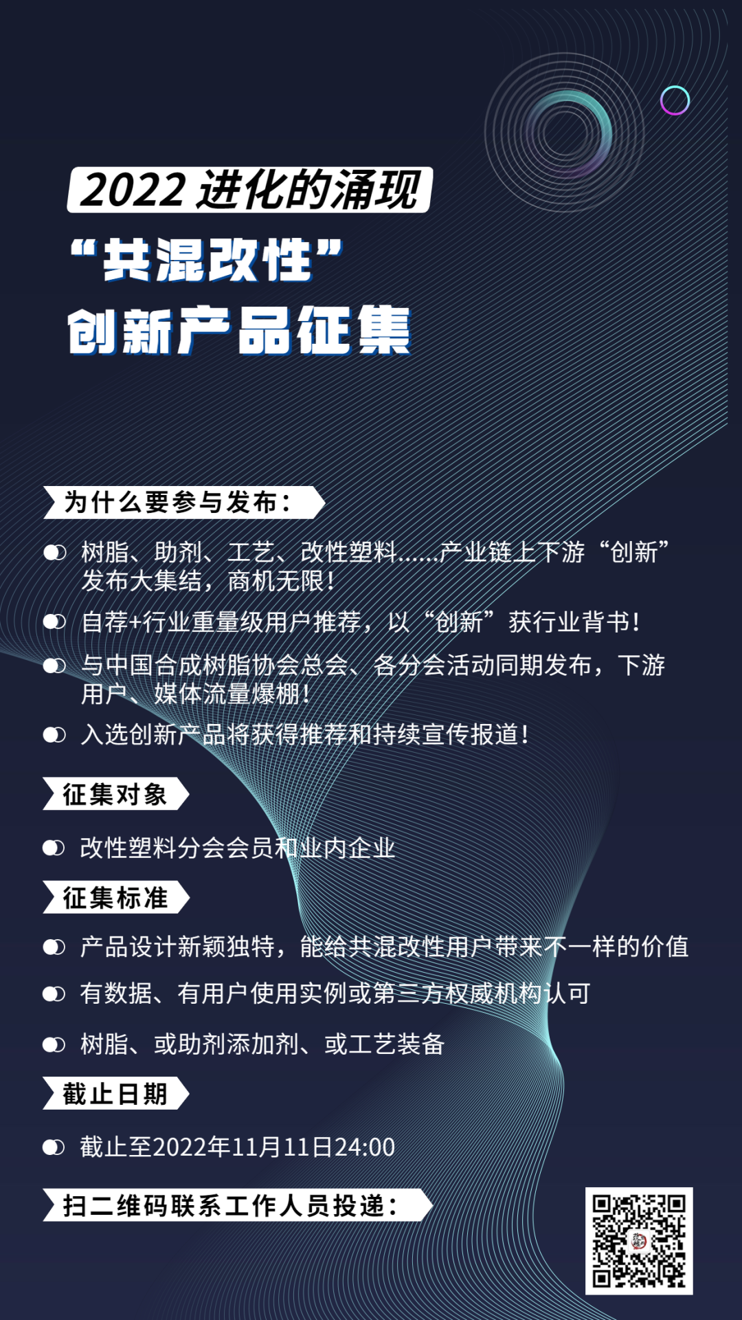 如果你觉得你(nǐ)的产品足够创新,足够新颖,能给共混改性用户带来不一样的价值,你可以报名产品征集,我们(men)期待在发布会上展示你的产品: