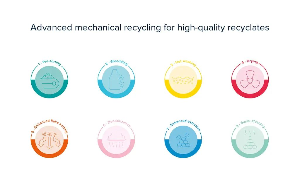 這個過程包括專(zhuān)門的預分揀,根據類型和(hé)顏色對塑料進行分類和切碎(suì),塑料被(bèi)切割成(chéng)洗滌所需的形狀和尺寸,熱洗以除去雜質,然(rán)後通過機(jī)械和(hé)熱幹燥(zào)進(jìn)行幹燥,再應(yīng)用(yòng)增強薄片分揀進(jìn)一步提高純(chún)度,接著除(chú)臭減少氣味,擠出進一步提(tí)高顆粒質量,最後是超淨技術,這是顆粒投入生產前的最後淨化步驟(如果需要的話(huà))。