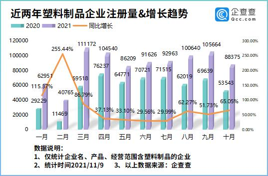 企查(chá)查數據顯示,2021年前10月我國新增(zēng)塑料(liào)製品企業88.49萬家,同比(bǐ)增長35.74%。最近的10月,我國新增塑料(liào)製品企業8.83萬家,同(tóng)比增(zēng)長65.05%。9月新增10.56萬家,同比增長51.73%。