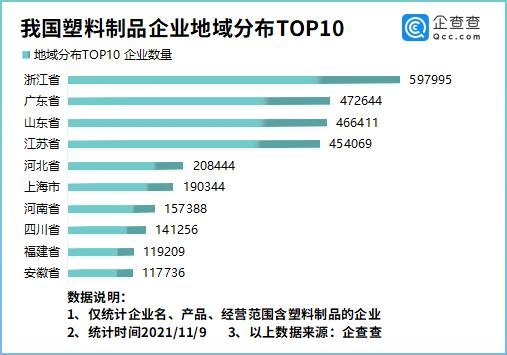 企查查數據顯示,從地(dì)域分(fèn)布來看,浙(zhè)江以(yǐ)59.79萬家塑(sù)料(liào)製品企業排名第一(yī),廣東(dōng)省、山東省分(fèn)別有47.26萬家、46.64萬家塑料製品企業,排在第二、三名。此(cǐ)後依次為江蘇省、河(hé)北省、上海市等。