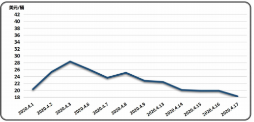 第三(sān)階(jiē)段內石油價格大幅下跌。4月中上旬WTI原油價格變化趨勢如圖15所(suǒ)示。4月中下旬WTI原油現貨價格再次暴跌43%,塑料(liào)原料價格指數震蕩回落。