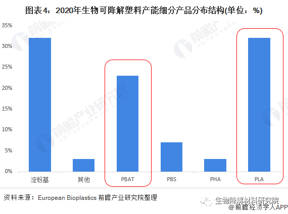 European Bioplastics (歐洲生物塑料(liào)協(xié)會)認為2020年(nián),在(zài)全球可生物降解的產能中,生物基塑料-可生物降解代表中PLA(聚乳酸(suān))和澱粉基塑料的產能占比最大,均為32%。石油基塑料-可(kě)生物降解代表中PBAT的產能占比最大,為23%。